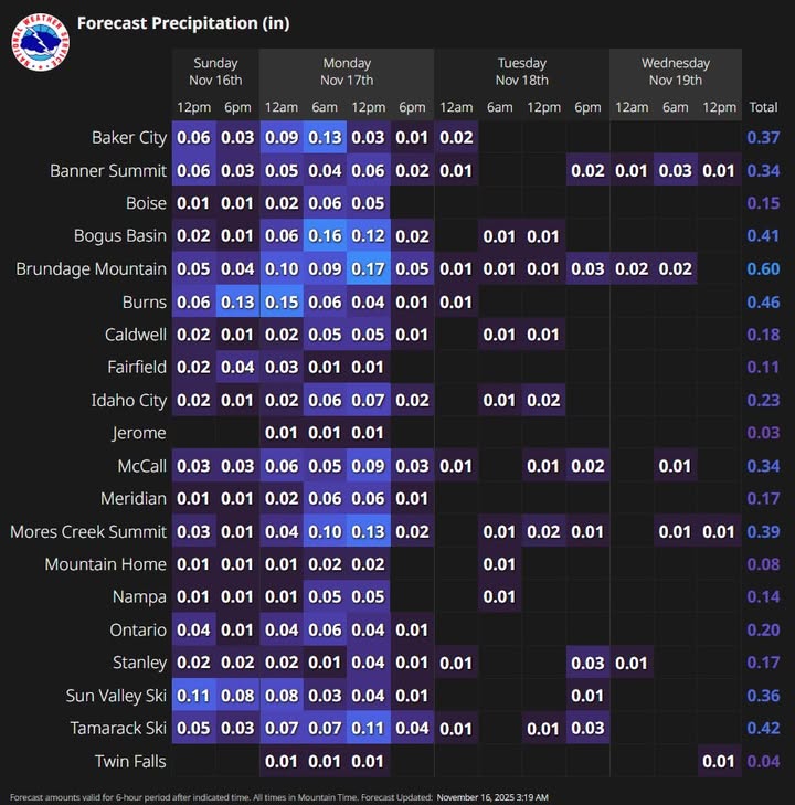 The U.S. National Weather Service in Boise, Idaho, is reporting that rain is moving into the region this morning and will continue through Monday. Forecasted precipitation totals for several locations in the region have been provided.