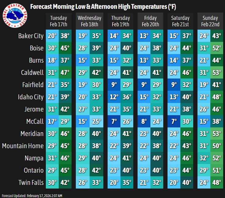 From the U.S. National Weather Service in Boise, Idaho: Updated temperature and precipitation probability/type forecasts for the week. Active winter weather will continue through Friday, before a high-pressure system settling in on Saturday returns warmer and drier conditions.