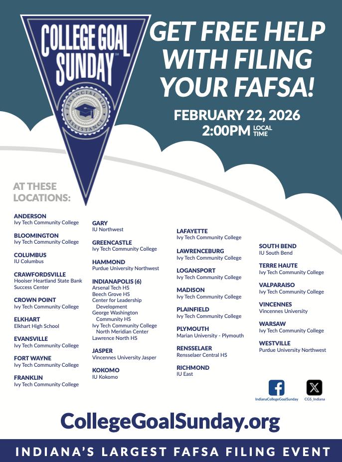 Indianapolis Public Schools says students and families seeking help filling out the Free Application for Federal Student Aid, or FAFSA, can receive free assistance at Indiana College Goal Sunday on Feb. 22, 2026. The event begins at 2 p.m. local time and will be held at more than 30 locations across Indiana, including Arsenal Technical High School, George Washington High School and Ivy Tech Community College, among others statewide.